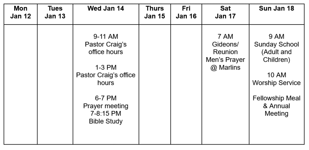 – This Sunday, January 18th, we will have our Fellowship Meal, followed by the church’s Annual Meeting.