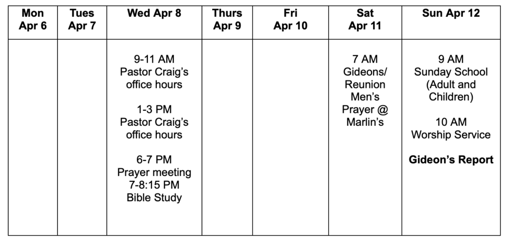 – The Gideon’s report will be during the morning worship service this Sunday, April 12th.